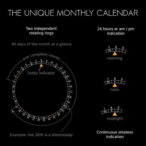 - Current date, day of the week and the unique Cronosurf's monthly calendar