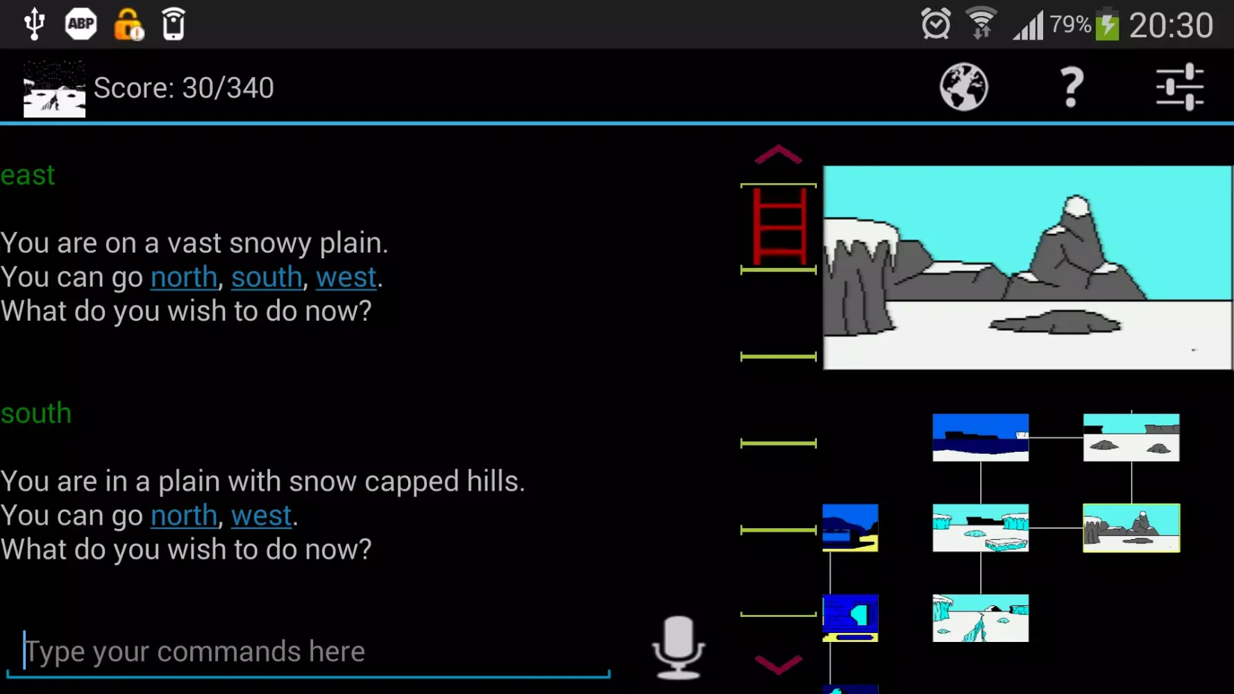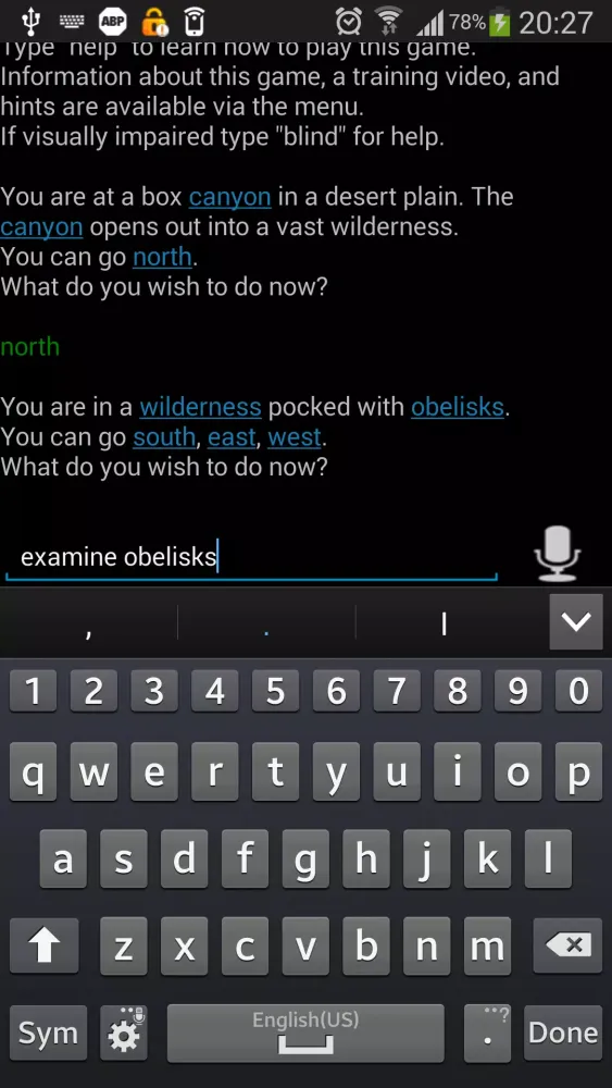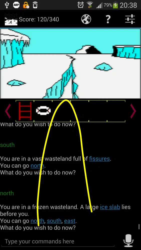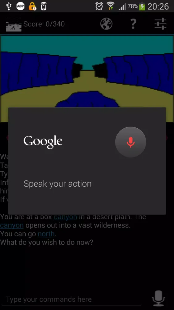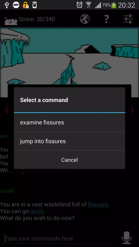 Gesture controls further enhance the gaming experience. Swipe gestures allow players to move in different directions, mimicking the movement of characters across the game world. Tapping on images provides additional context, enabling players to "look" at their surroundings. The game also supports speech input for issuing commands, making it accessible for users who prefer voice-based interactions. Additionally, text-to-speech functionality ensures that visually impaired players can enjoy the game without barriers. Font size adjustments cater to different reading preferences, ensuring comfort for all players.