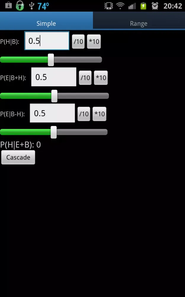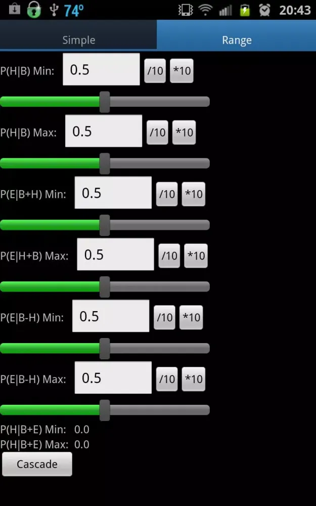 If exact values are unknown, users can utilize the "Range" tab to provide minimum and maximum estimates for each parameter. The app then calculates the corresponding range of possible outcomes for ( P(H|B+E) ), offering a comprehensive view of uncertainty in the result. This flexibility makes it especially useful for situations where precise data may be unavailable or difficult to obtain.