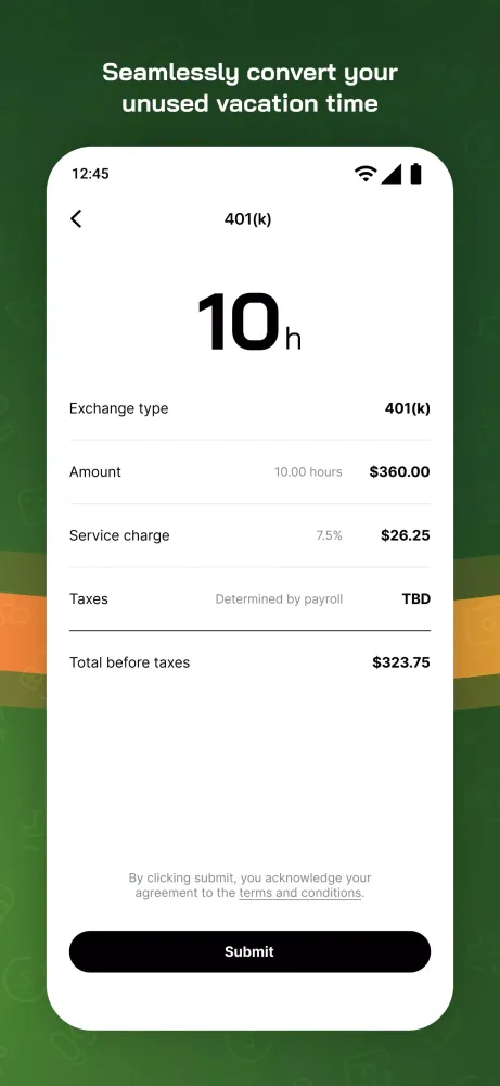 The process is straightforward and user-friendly. First, review your available time off balance through the app. Next, decide how you'd like to apply the value of your excess hours—whether it’s adding extra funds to your paycheck, investing in your future, or contributing to a cause close to your heart. Simply enter the number of hours you wish to exchange, confirm the transaction via email, and enjoy the rewards on your next paycheck! It's that simple.