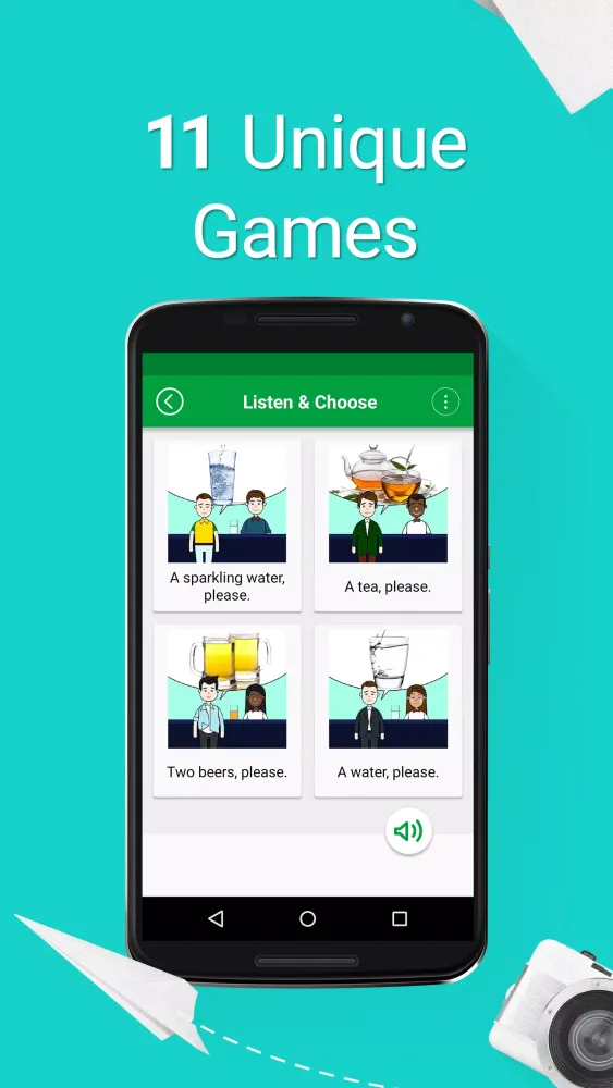 The app features 11 fun games that help you practice your listening, writing, and speaking skills. With four learning levels—beginner, intermediate, advanced, and expert—you can gradually improve your proficiency. The content is organized into 20 topics divided into 145 subtopics, ensuring you have the right phrase for every situation. Topics include greetings, conversations with friends, basic sentences, travel, transportation, hotel, restaurant, food, shopping, work, business, and more.