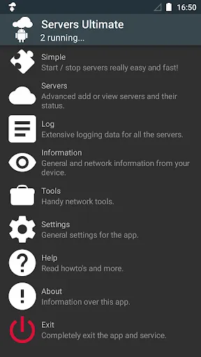 Start a server easily on the 'Simple' tab or go advanced and add users, allowed IP's and more! Multiple servers can be run at the same time! No root needed (exceptions below).