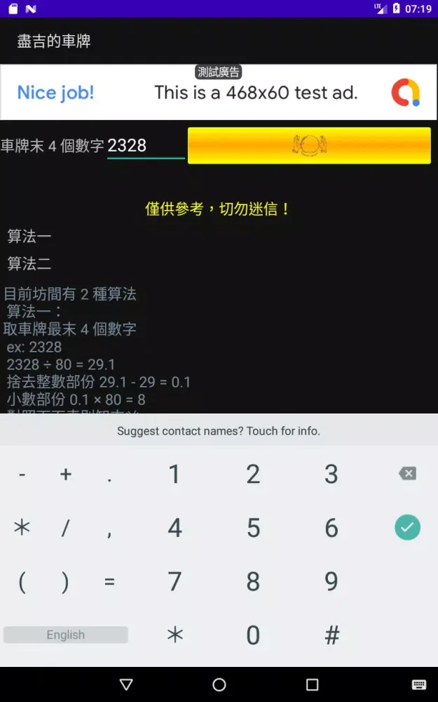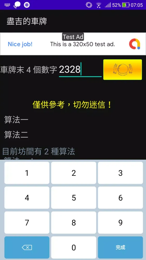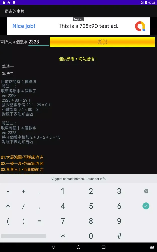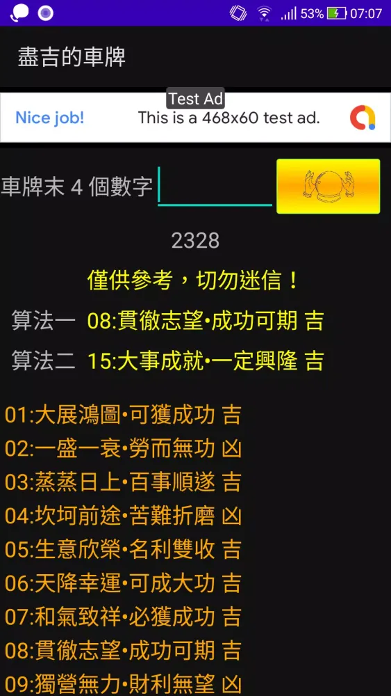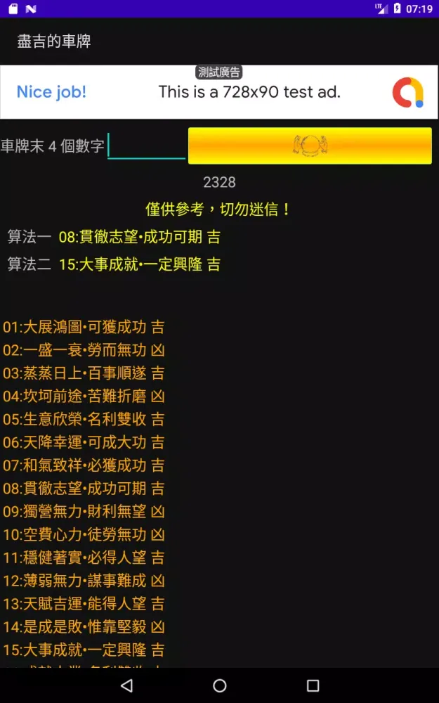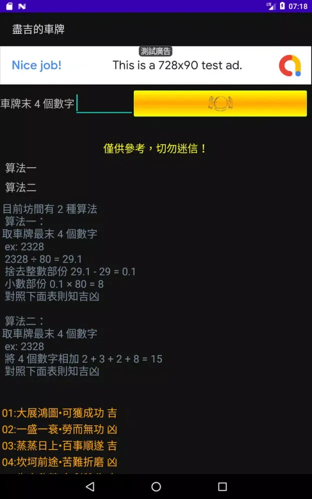 The application "盡吉的車牌" (which roughly translates to "Extremely Auspicious License Plates") is an innovative tool designed to help users find the perfect license plate for their vehicle. Whether you're looking for something that aligns with personal beliefs or simply want to have some fun exploring different combinations, this app offers a unique way to discover license plates that resonate with you. At its core, the app provides two distinct algorithms to analyze the numerical values of license plates and determine their perceived fortune or misfortune. These algorithms are based on traditional interpretations of numbers and their meanings, making them both intriguing and entertaining.