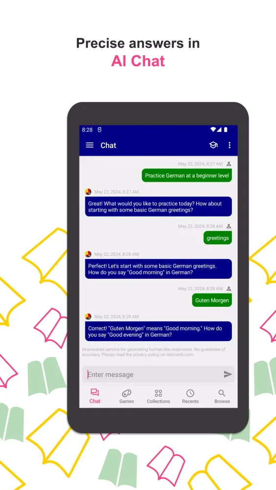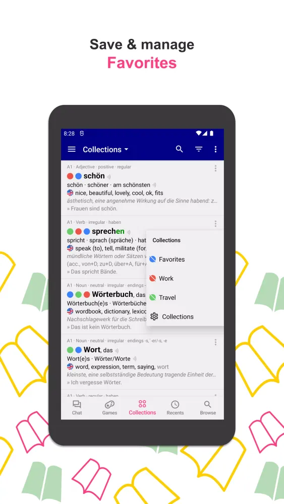 The application offers a plethora of features designed to enhance your learning experience. You can access inflection tables that include all possible word forms, providing you with a complete understanding of each word. Additionally, the app includes translations, synonyms, meanings, and detailed grammatical explanations. An interactive chat feature allows you to converse with a German teacher AI, helping you refine your skills through real-time interaction. The app also includes example sentences that demonstrate how words are used in context, making it easier to grasp their practical applications. Engaging games are included to reinforce your learning, with progress tracking to monitor your improvement. Vocabulary is organized into levels from A1 to C2+, ensuring that learners at every stage can find relevant content.