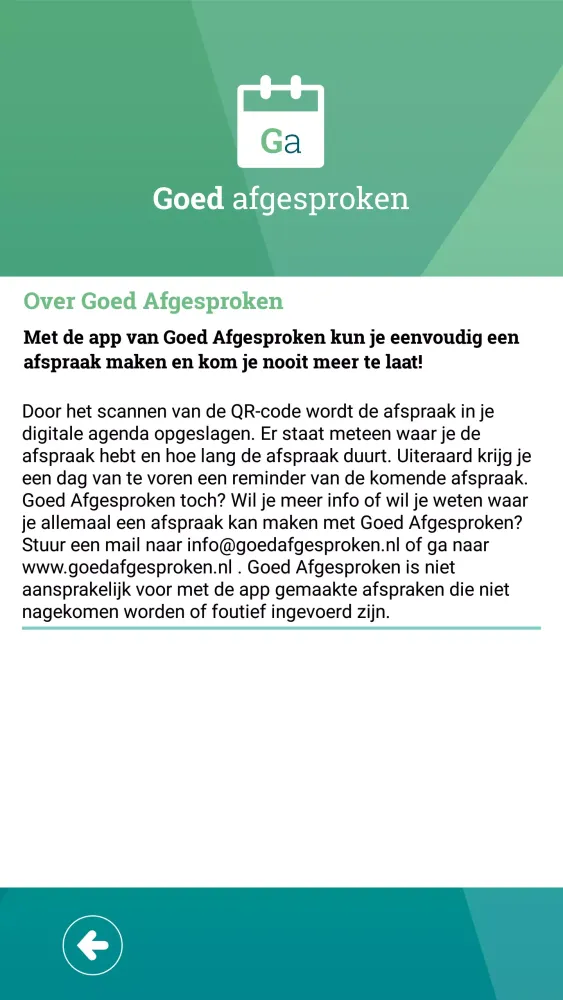 Please note that Goed Afgesproken is not liable for any appointments made through the app that are not honored or incorrectly entered. We recommend double-checking all appointment details to ensure accuracy and reliability.