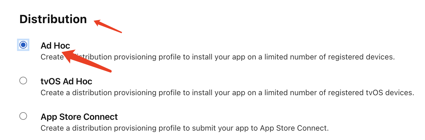 - Select the matching Ad Hoc certificate. If none is available, create one first.