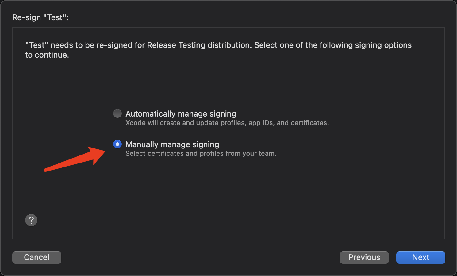 - Choose Manually manage signing so you can specify the certificate and profile yourself, then click Next.