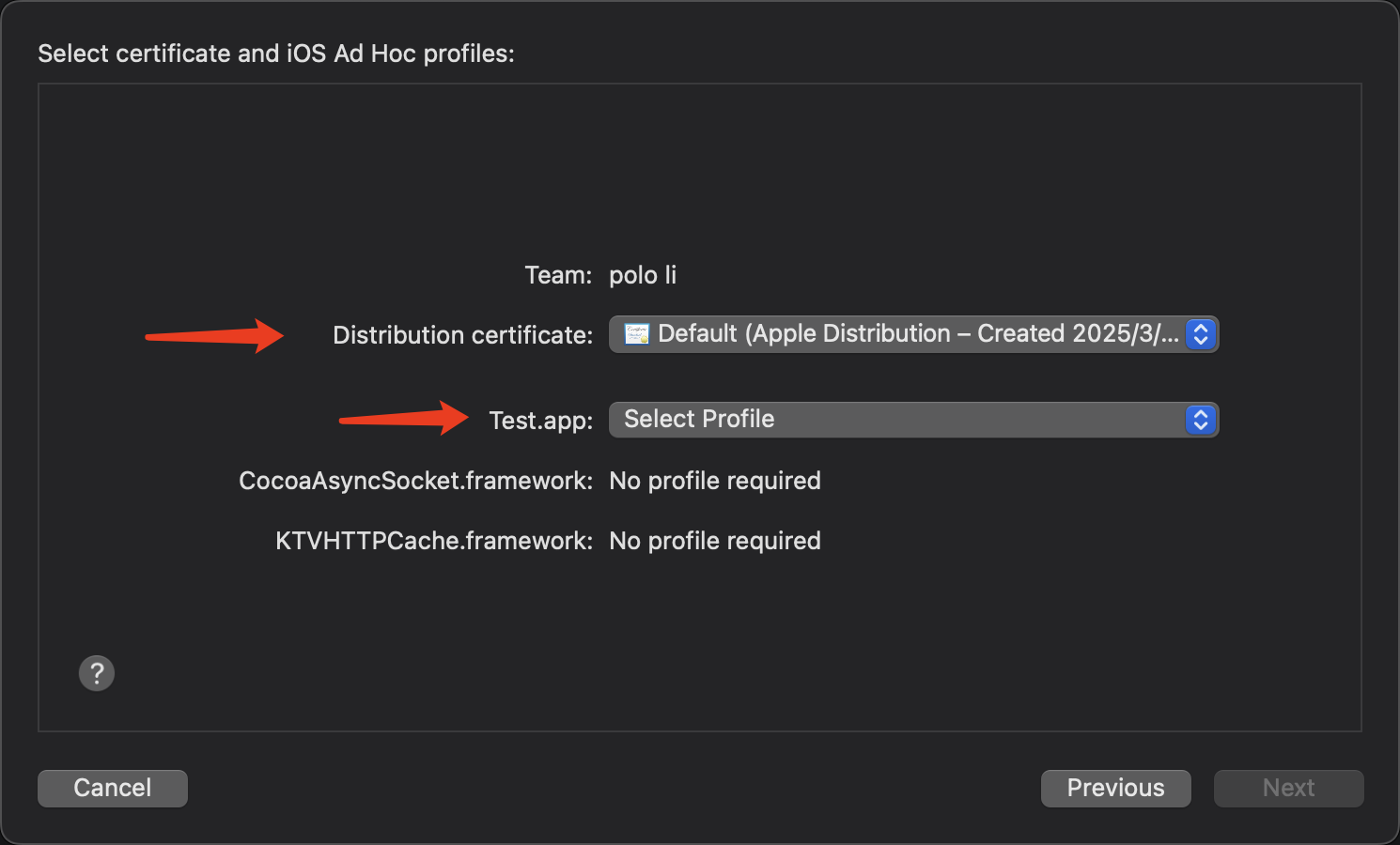 - For the certificate, pick the Ad Hoc certificate from the previous section; for the profile, pick the one you just downloaded.