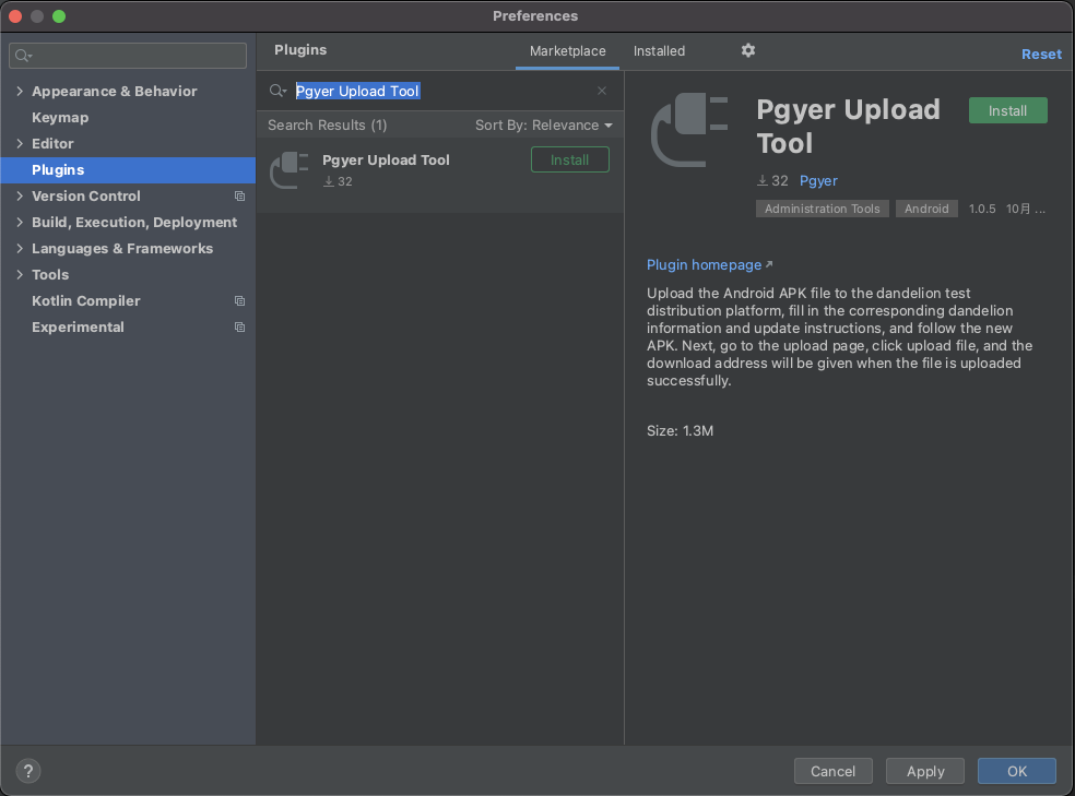 Open Android Studio → Preference → Plugin, search for Pgyer Upload Tool, click Install on the right, and restart Android Studio.