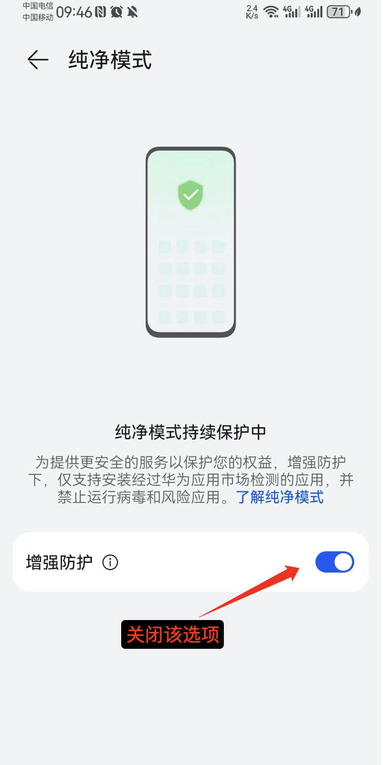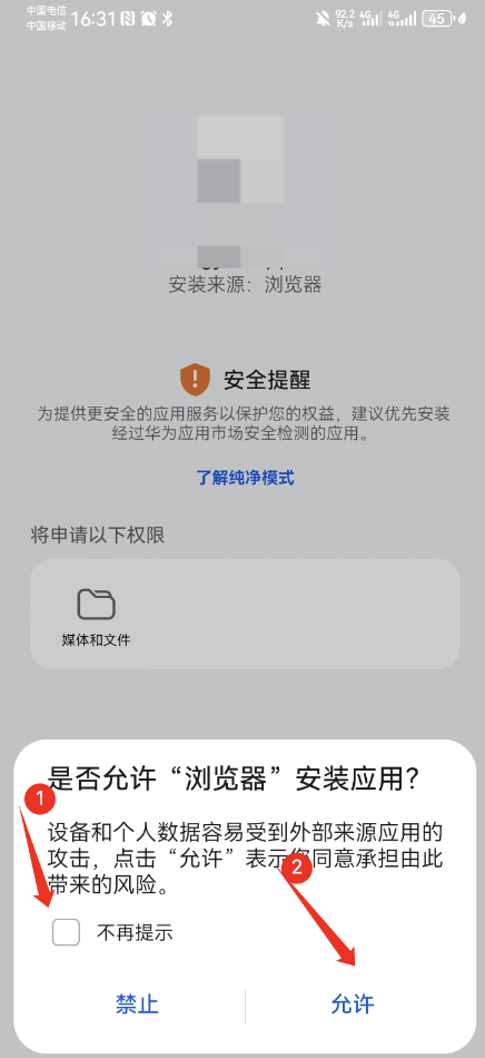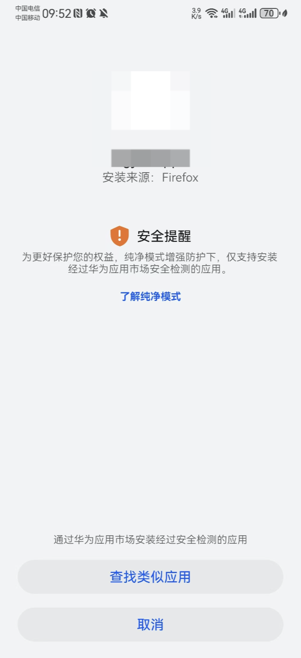 With Pure Mode turned on, the system blocks apps that do not come from Huawei AppGallery — the install screen may not even show an install button.