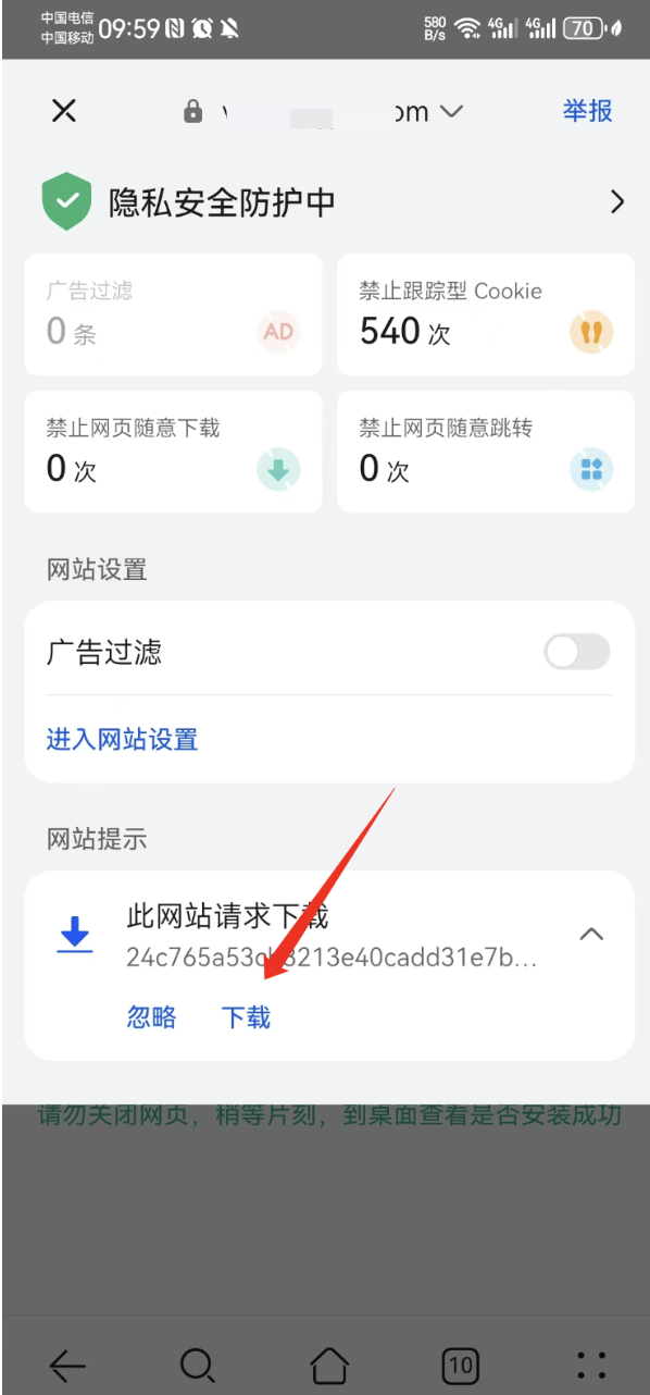 When the Huawei browser shows a download confirmation, it hides itself automatically after a few seconds if you do not tap in time. Tap the bell icon in front of the address bar to reopen the prompt, then tap Download at the bottom of the dialog.