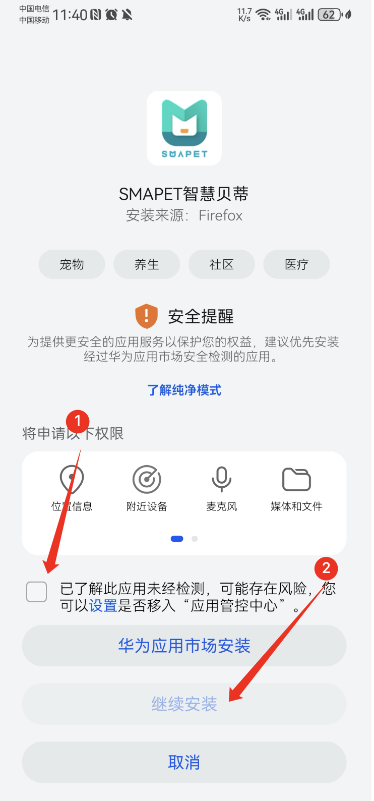 Some versions recommend downloading the same app from Huawei AppGallery. Tick I understand this app has not been checked and tap Continue to install to complete the local APK install.