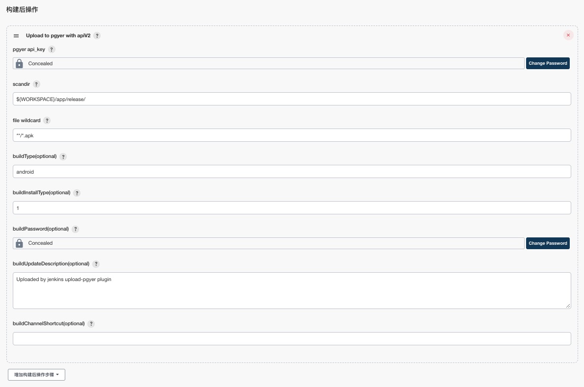 在 Jenkins 的 Job 配置页面 构建后操作 中添加构建步骤 upload to pgyer with apiV2: