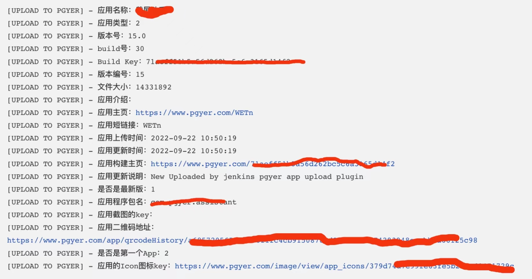 执行构建后,蒲公英上传插件会输出对应日志: