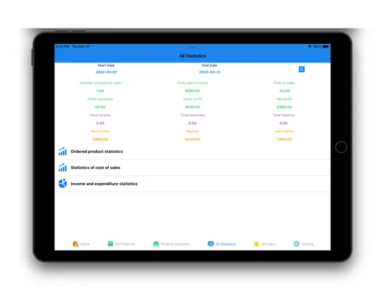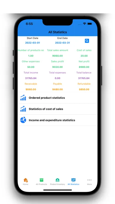 - Statistics include: profit statistics, business income, business expenses, sales revenue, cost of sales, sales profit, net profit, product inventory, total sales amount, total purchase amount, sales resale, purchase resale, receivables, payables , should be refunded, etc.