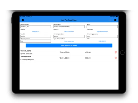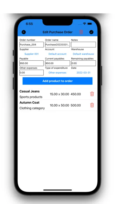 - Purchase and return orders, sales and return orders correspond to multiple products, each order can add multiple products at one time, and the products in the order can be modified or deleted from the order.