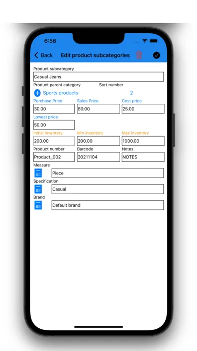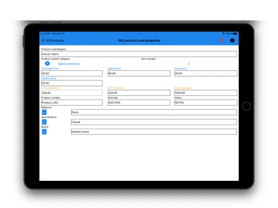 - Custom product sub-categories (including classification, name, specification, unit of measure, sorting number, product number, product barcode, remarks, date, purchase price, sales price, cost price, minimum selling price, initial inventory, minimum warning , maximum inventory, etc.).