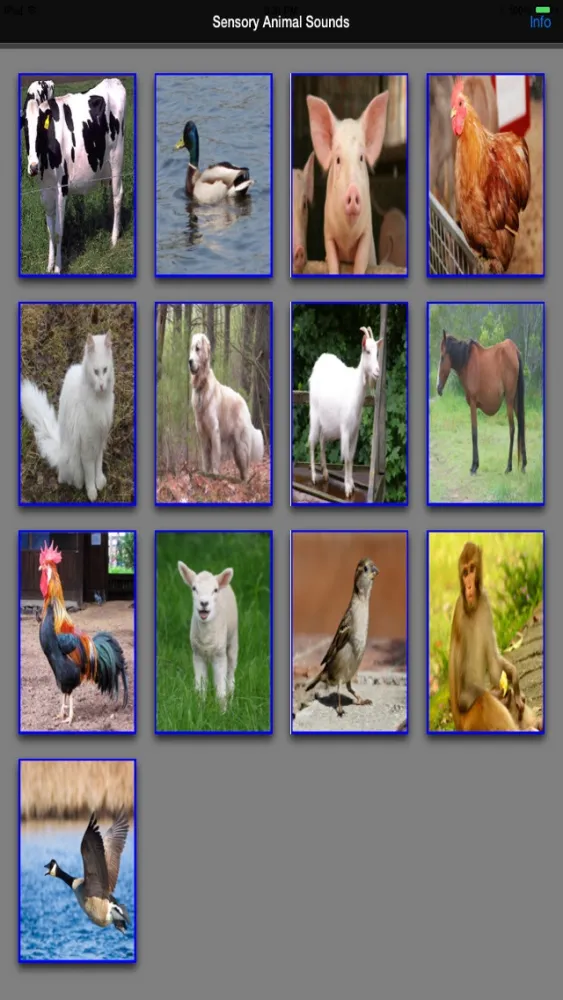 Sensory Animal Sounds was created for Sensory Stimulation in Seniors programs. Animal buttons display full size animal pictures, plays the animal sound and then says the name of the animal. The user touches the animal picture to remove the picture once the sound finishes playing.