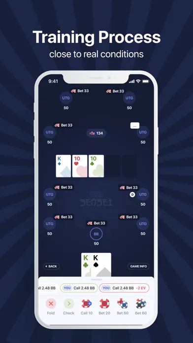 GTO Sensei will be your personal poker coach on the way of becoming professional poker player. The basis of the training process is the game format as close as possible to real conditions. The user can choose the situation that he would like to train, and then proceeds directly to the game against the AI, which plays according solved optimal strategies. All actions are analyzed in real-time and the app provides real-time information about mistakes, which allows you to improve strategy and plug leaks. All played hands could be analyzed in details in accordance to GTO strategies.