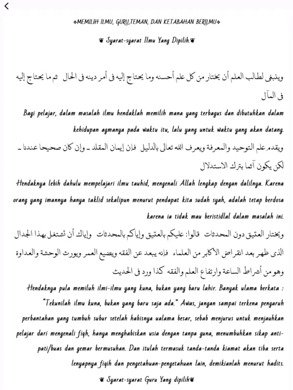 - ketiga, cara memilih ilmu, guru, teman, dan ketekunan.
