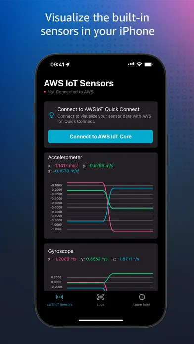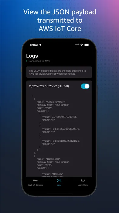 AWS IoT Sensors supports built-in sensors, including accelerometer, gyroscope, magnetometer, barometer, and GPS. It provides a frictionless way for you to use AWS IoT Core without needing an AWS account, credit card, or prior AWS or IoT experience. The app is designed for ease-of-use and to showcase how AWS IoT can be leveraged to collect, process, and visualize sensor data for IoT applications.