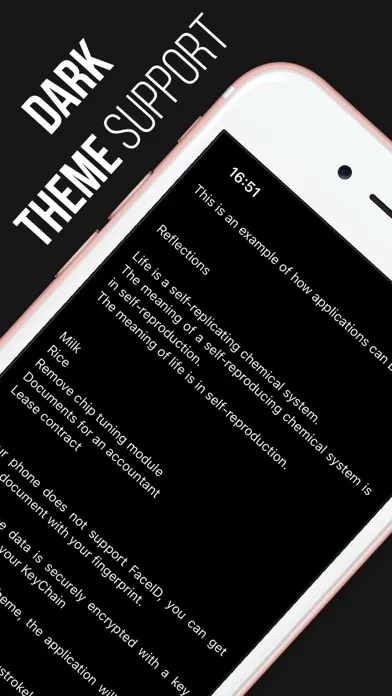 Thankfully to the automatic saving after every change, you don't have to worry about the safety of your notes, all your valuable strings of text will be encrypted and uploaded to your iCloud account, so even if you will lose your device, your ideas won't be lost. Encrypting key is using Keychain, so it is secured by top-level standards.