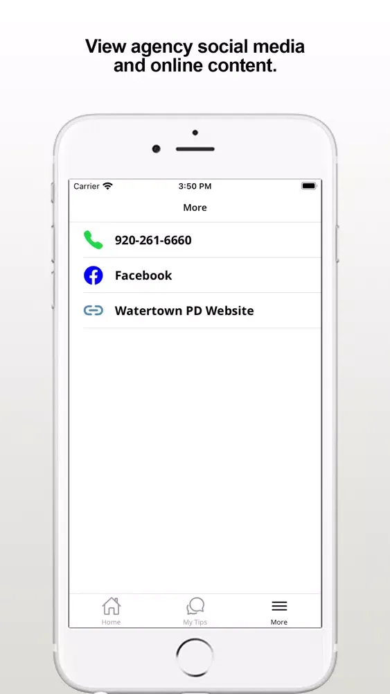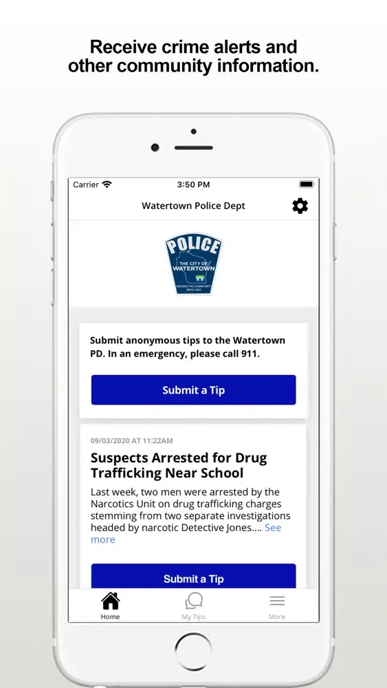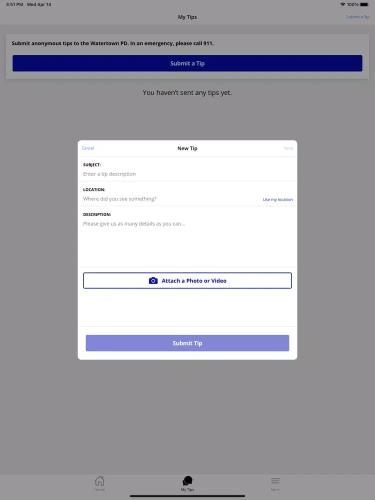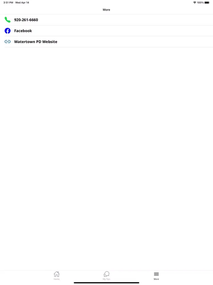 The WPD Tips app provides citizens the ability to submit anonymous tips to the Watertown, WI Police Department. The app also displays agency crime alerts and other organization web and social media content.