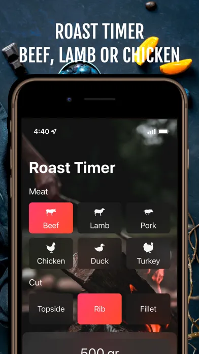 • Choose meat between beef, lamb, pork, chicken, duck or turkey; select your cut; finish it by setting your cooking style.