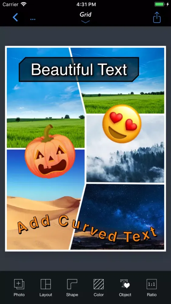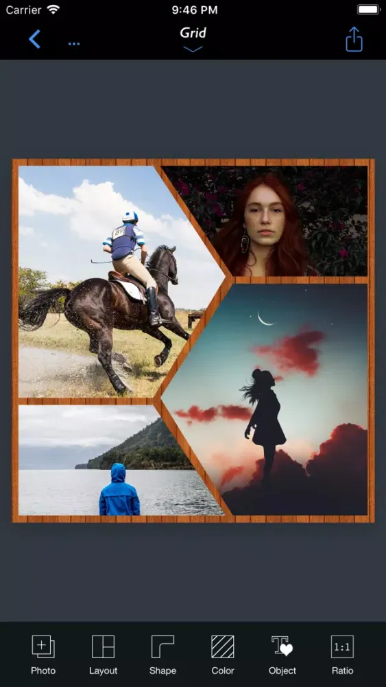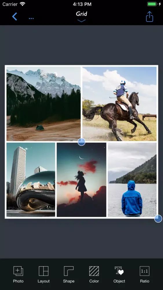 - Grid : Combine mulitple photos with hundreds of rectangular and polygonal layouts.