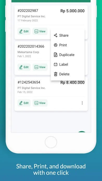 - Invoice sharing feature, download and print directly from the device.