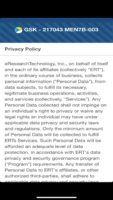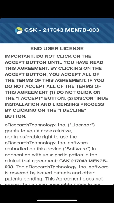 GSK eCOA App is intended for use in collecting patient reported outcomes relating to a clinical trial. Patients must be given accounts by a participating site in order to log in to the app.