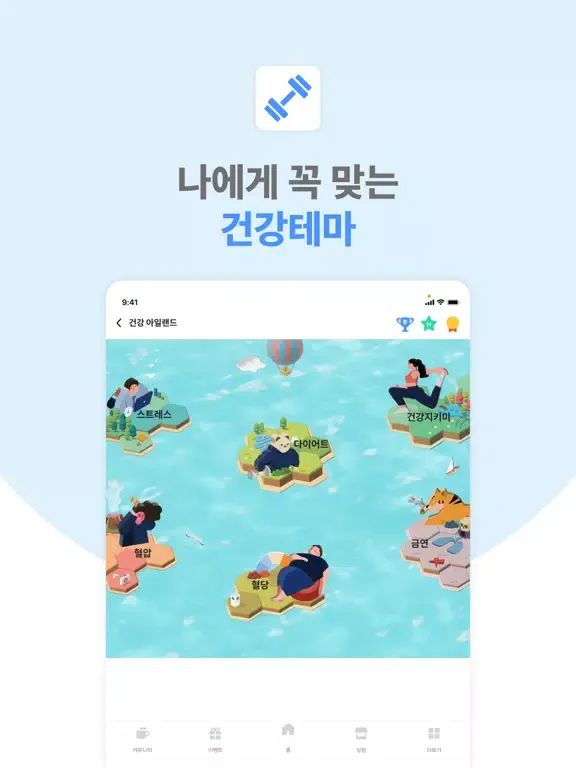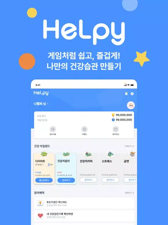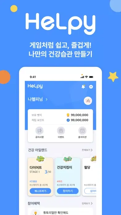 # 간단한 수치 입력부터, 운동 따라하기, 러닝, 식단 입력, 퀴즈, 게임 등 재미있는 건강미션이 가득!