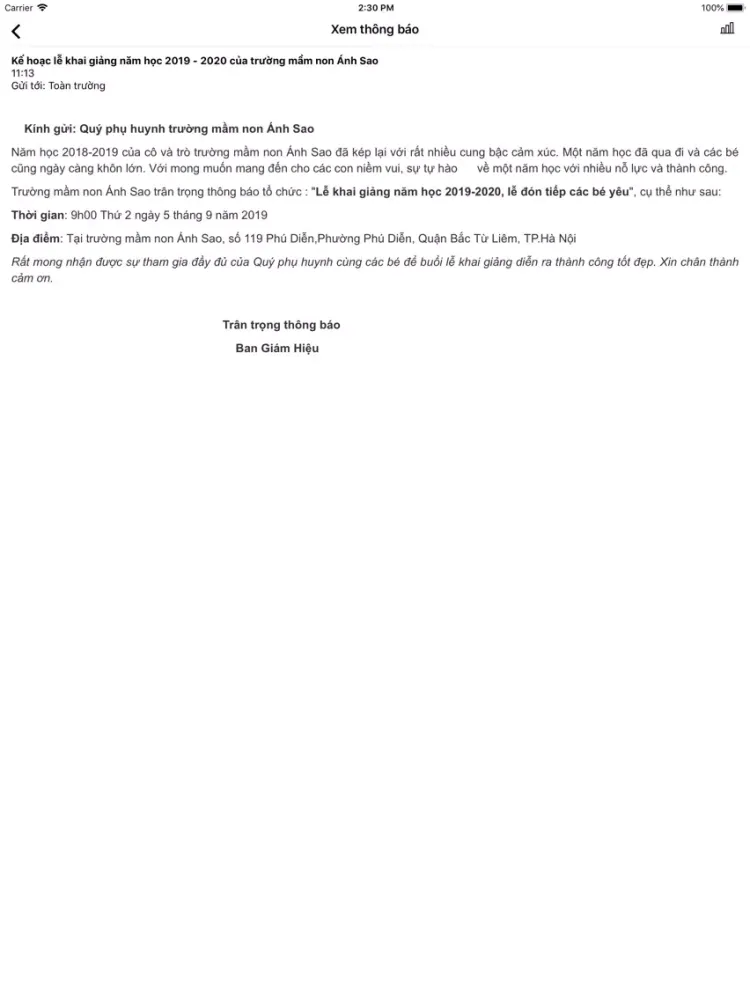 - Nhà trường có thể gửi các thông báo trực tiếp tới quý phụ huynh thông qua ứng dụng thay vì phải sử dụng giấy (có thể thất lạc)