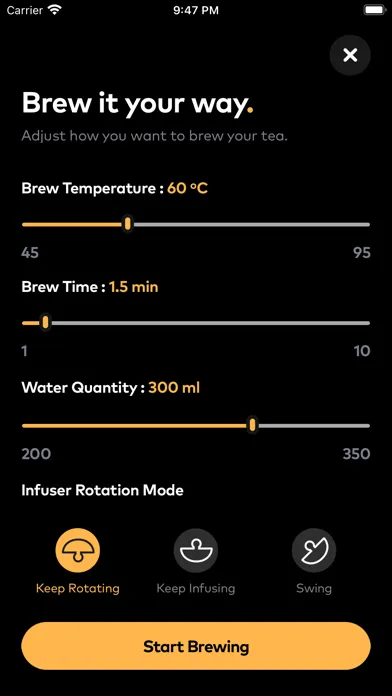 • Adjust brewing using our tea master brewing page. Here you will be able to change the time, temperature of brewing. You will also be able to modify the infuser rotation and speed to change the brew as you desire.