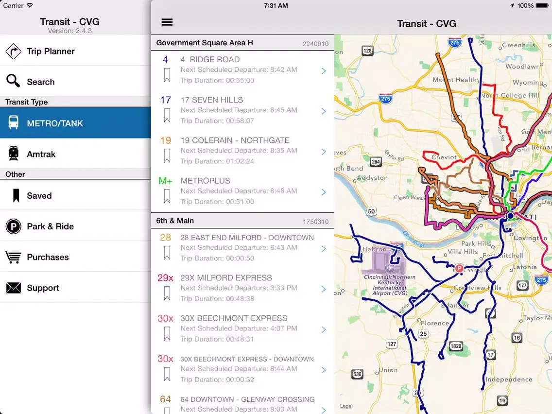 Includes a fully searchable database of all bus stops and routes serviced by Southwest Ohio Regional Transit (SORTA) and Northern Kentucky Transit (TANK) with quick access to all departures scheduled for the day. Weekly updates are downloaded in the background.