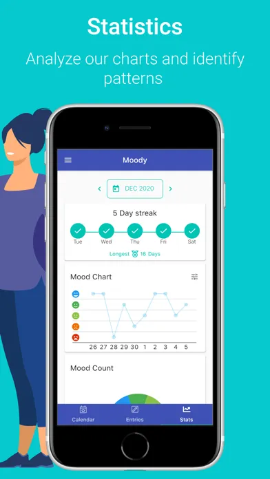 Insightful statistics will help you learn more about yourself, maintain your mood-tracker journaling streak, identify common mood and activity combinations, and more.
