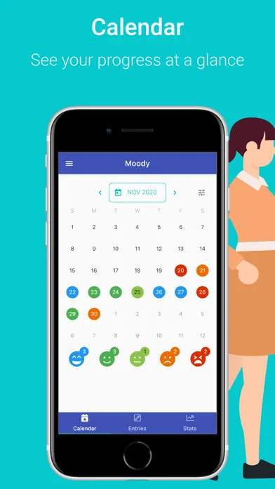 Moody Journal has an elegant calendar view that acts as a chronological mood-tracker and let's you quickly spot trends over a period of time. Tap on a day to jump to the diary entries for that day.