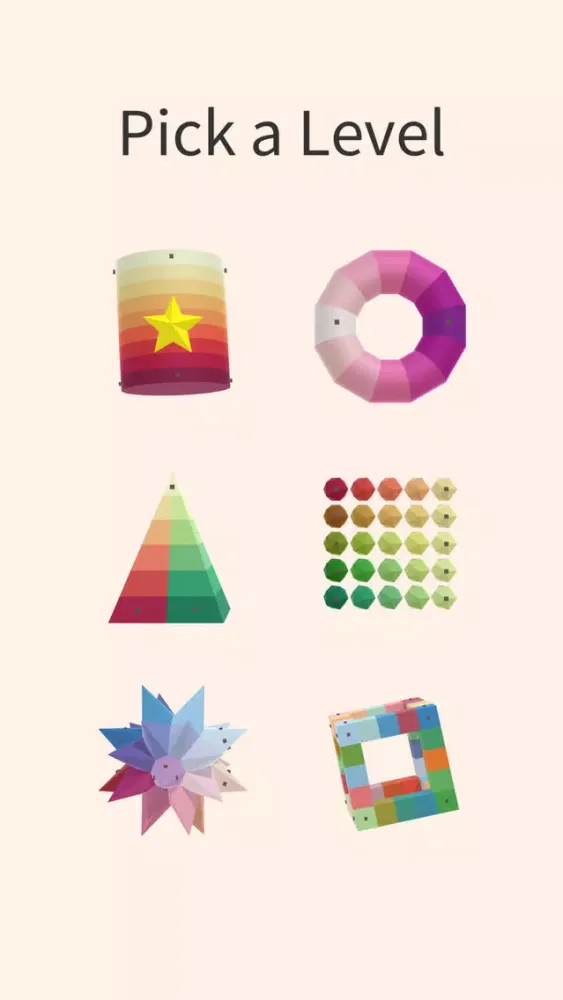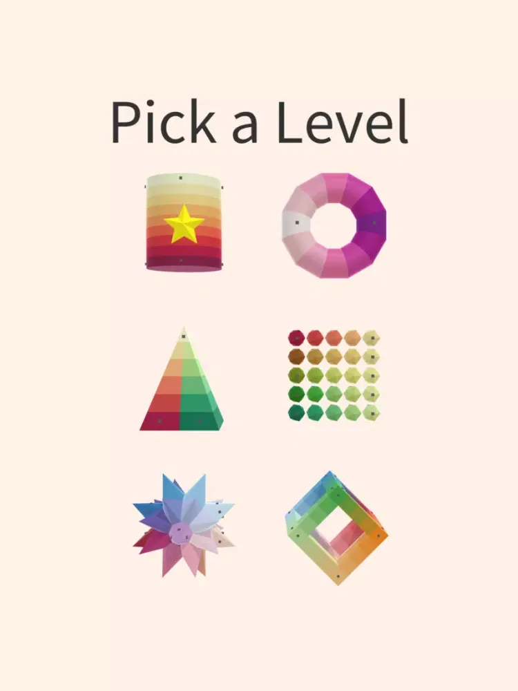 Pick a level and sort the colors back into their starting order. Tap on any two colors to swap them. Drag your finger to rotate the level. Try your best to sort all 6 levels!