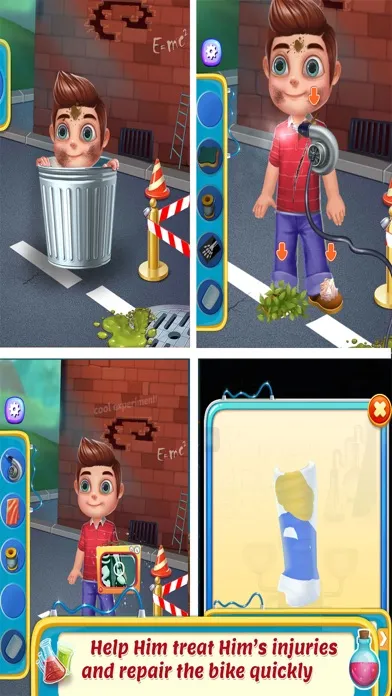 Repair your scooter to reach at the science fair competition in time. Hurry up do it fast! Now clean up yourself to get ready for competition because you have to look smart and presentable for the judges. Set up your hair and make the lips glossy. Dress in outstanding outfits. Oops! Your bro has fallen inside bin while getting out, help treat his injuries and cleanup his clothes. Will you and your bro be able to win 1st prize of best scientist at the science fair?
