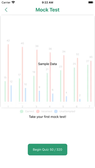 After you have practiced all types of questions, you can take a Mock Test with 50 questions. The Mock Test has questions selected randomly from each topic. Scores for the mock tests taken in the past are displayed in a bar chart. This is a great way to track how you are progressing in mock tests. There is no limit on how many mock tests you can take.