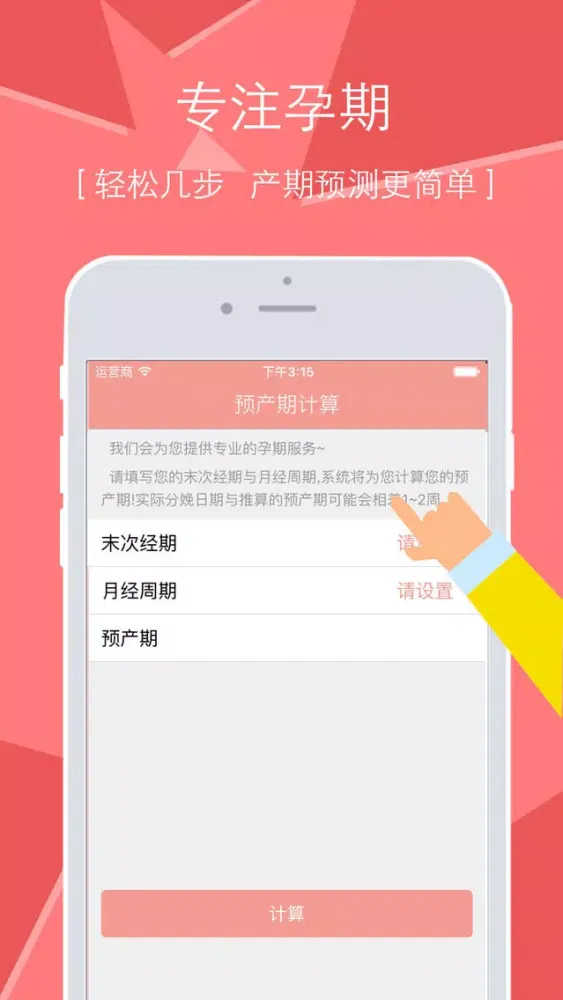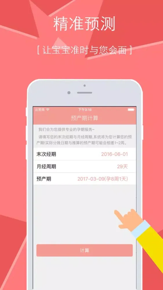 简单、实用的孕期必备工具,帮助您科学、准确地计算出您的预产期,让您清晰地知道与宝宝见面的日期。