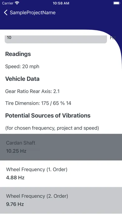 The app helps to locate if the vibration sources are the wheels or the cardan shaft. It is easy to setup. You can create a projects, specify the wheel size and gear ratio and start a measurement. Afterwards you get a chart of the measured vibrations. With the help of the project specific data and the speed the potential frequencies of tires ans gear shaft are calculated and displayed in the chart.
