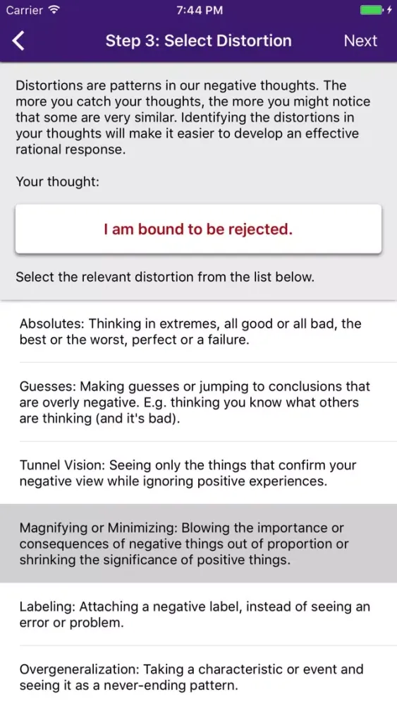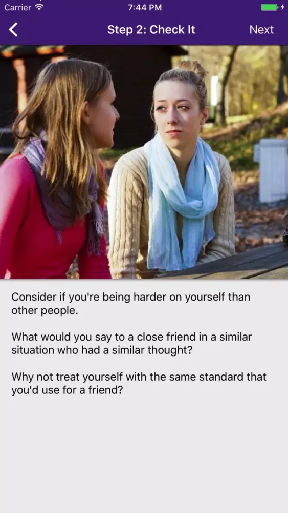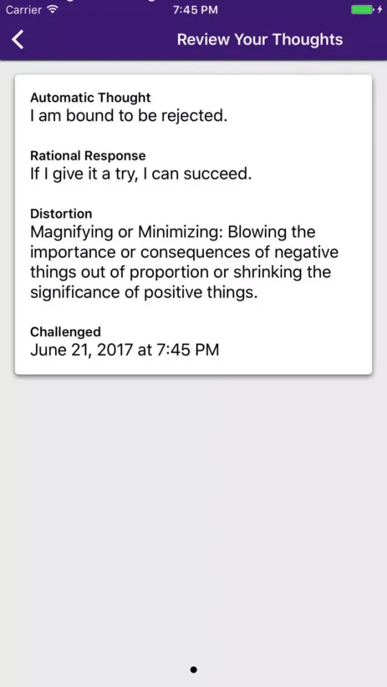 Do your thoughts have a mind of their own? Unhelpful thoughts can exaggerate negative experiences, lead you to be overly critical, and bring down your mood. Put your thoughts to the test with Thought Challenger to see if they stand up in the face of questioning. With this app, get into the habit of changing your perspective and move toward a more balanced outlook on life!