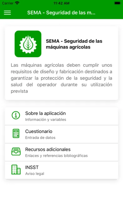 La aplicación permite la comprobación de las condiciones de seguridad durante la utilización de diferentes categorías de máquinas agrícolas mediante un cuestionario basado en los requisitos establecidos por la Directiva 2006/42/CE (Real Decreto 1644/2008) y las normas armonizadas pertinentes.