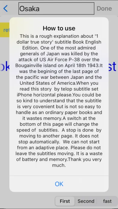 You start this App on 1st page by pushing + button on top right hand side and line right hand > . You push 'story button'.A story telop subtitle about a Japanese general the name of whom is isoroku Yamamoto in the past pacific war starts.It is said that he did not like for Japan to fight against the United States of America as he had visted United States of America several times and known its industrial power very well. This is a story written by a Japanese who visited his Japan home town Nagaoka city early in 1943 and saw his old house and the window of second floor where was his study room.We wish that If you could find something useful in this peaceful your country and our Japan.The numeral 56 on the icon specify his general first name isoroku in Chinese character 五十六.