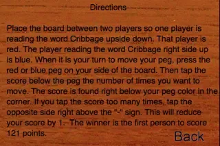 Cribbage is an exciting card game. The first player to score 121 points wins the game. A board is typically used to keep score. This app is a simulated cribbage board. It can be used to keep score during your real life, face-to-face card games.
