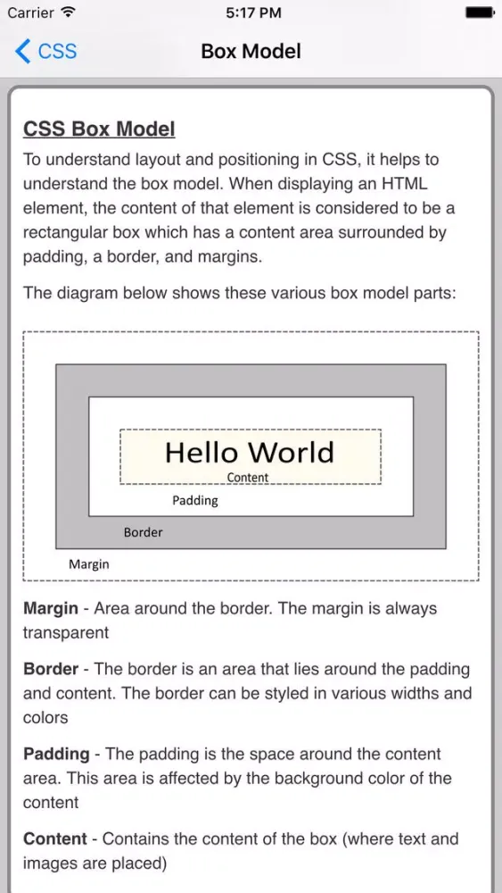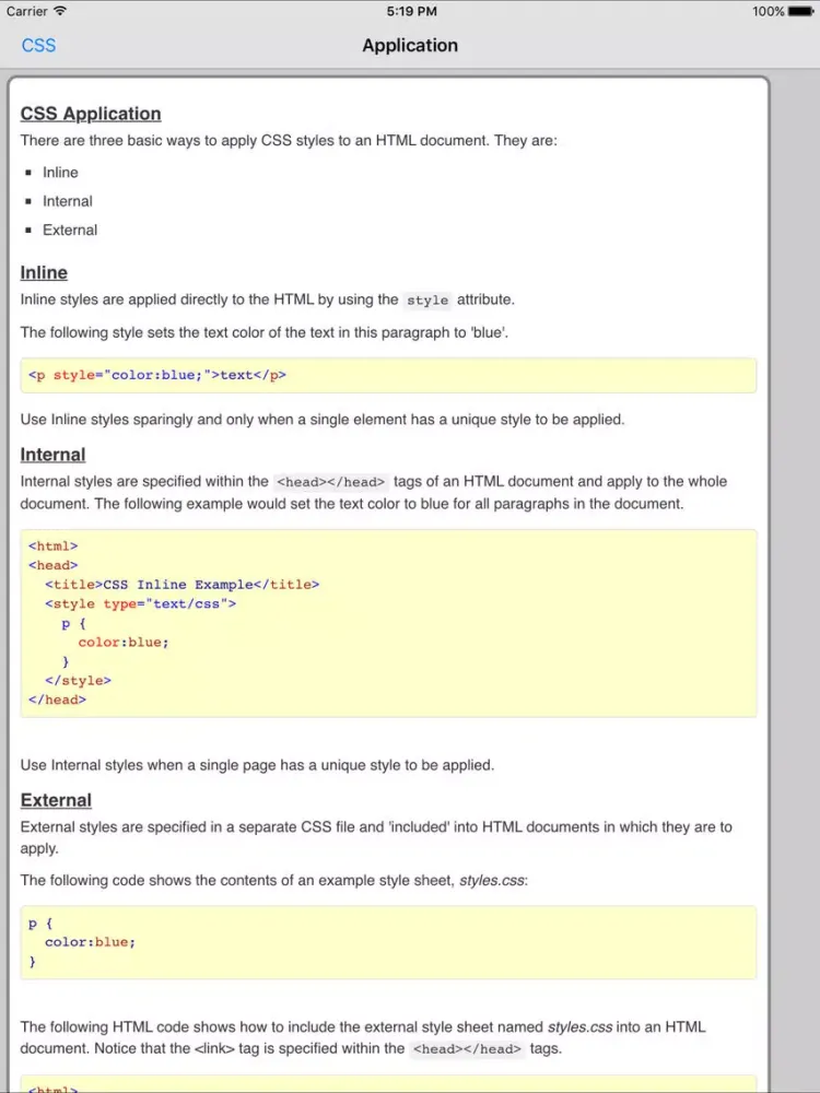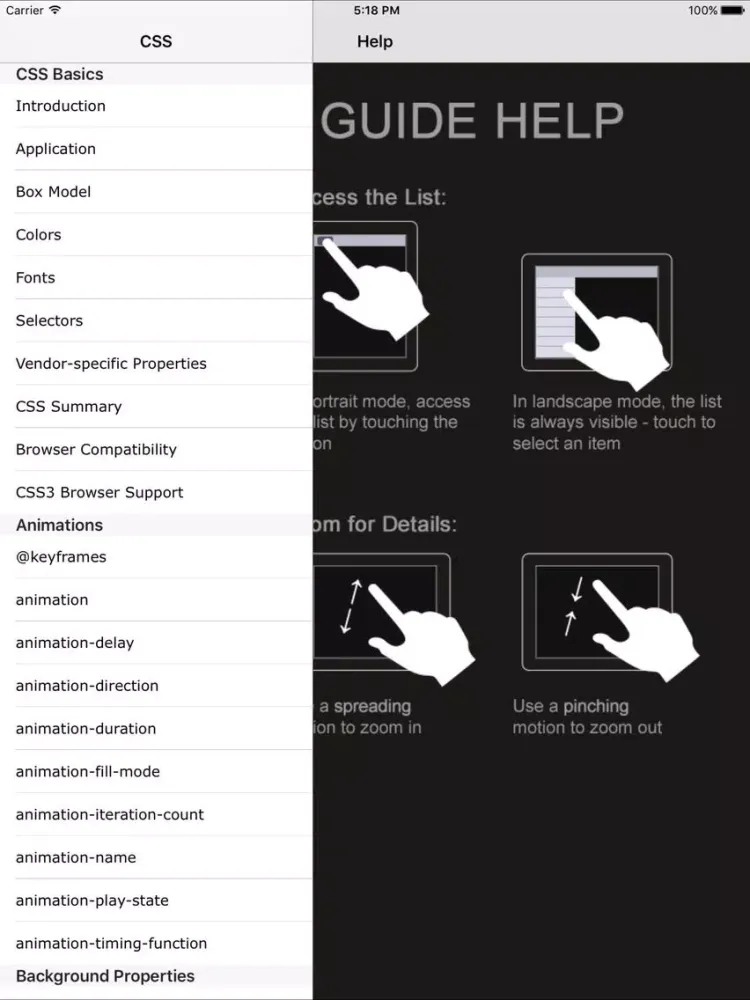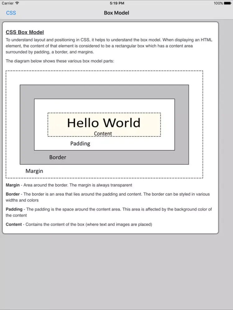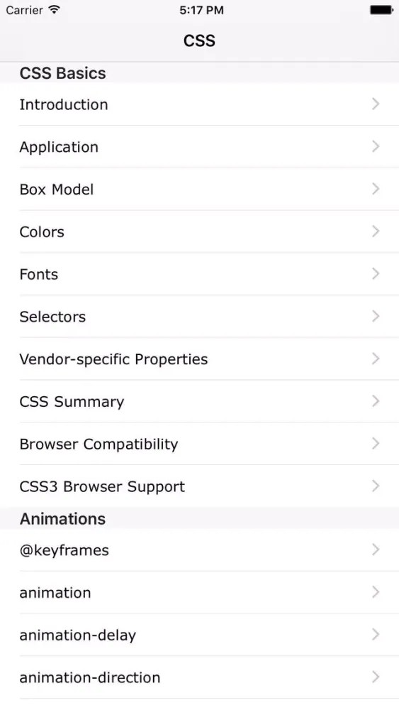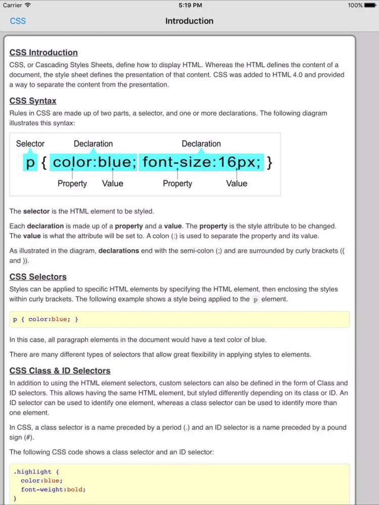 The CSS and CSS3 properties are categorized and searchable. Each property information screen contains a property description, values the property accepts, examples, browser compatibility, and version information. In addition, some properties include the display results of the various property values (e.g. border styles, text decoration, etc.).