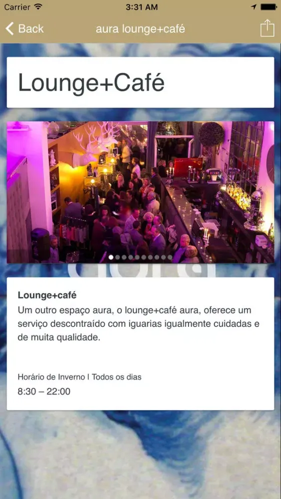 O espaço aura oferece ao jantar e durante todo o verão o conceito “aura terrace”.Champagne&ostras, cocktail´s, snacks gourmet, e iguarias portuguesas “a la carte”, são servidos à hora de jantar, todos os dias durante o verão.
