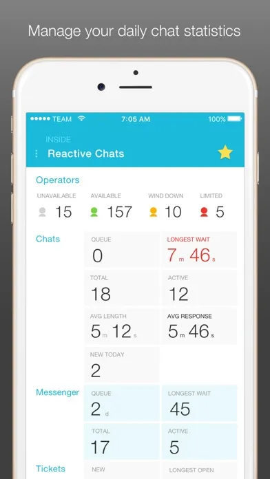 INSIDE Manager app allows you to view real time stats of your INSIDE enabled sites including Chats, Tickets, Operators and various important metrics.