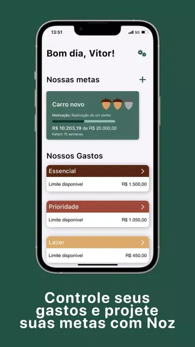 Dentro de Noz você poderá guardar dinheiro e alcançar suas metas junto com seu parceiro/a.